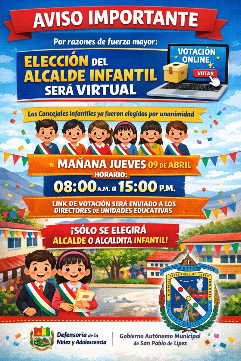Importante: ELECCIÓN DEL ALCALDE/SA MUNICIPAL INFANTIL Y CONCEJO MUNICIPAL INFANTIL Actividades, Comunicados 17 de abril de 2026 Compartir: ELECCIÓN DEL ALCALDE/SA MUNICIPAL INFANTIL Y CONCEJO MUNICIPAL INFANTIL 👏 ¡Felicidades a nuestras Autoridades Infantiles 2026! 👏 Volver